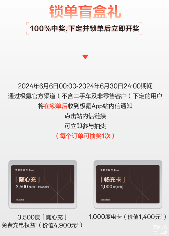 极氪001的6月限时购车福利也十分诱人,包括旧车置换新能源最高可享受3000元补贴,报废旧车更换新能源的补贴高达10000元等。此外,从即日起至6月30日,购买极氪车型的用户还可参与抽奖活动,分享千万豪礼,并有机会获得单人50万极分的超级大奖。