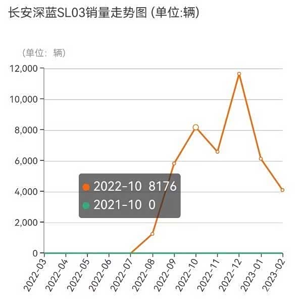 根据长安深蓝官方数据显示,长安深蓝SL03 于 1、2 月份仅交付了6137 辆和 4103 辆,分别环比下跌 47.32%,33.14%,从整体销量上看,呈现出较明显的下滑趋势。