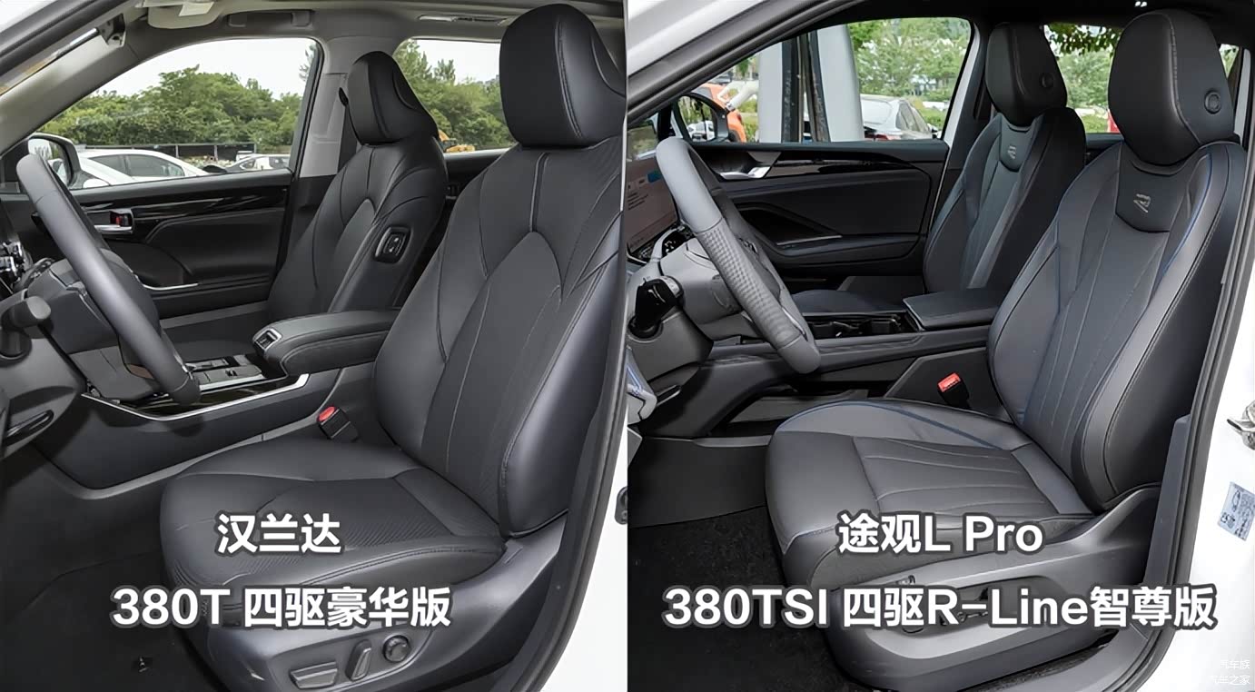 汉兰达的座椅为Nappa真皮+仿皮材质,但前排座椅仅具备加热功能。而途观L的座椅采用翻毛皮+仿皮材质,前排座椅具备加热、通风、记忆、按摩四种功能。