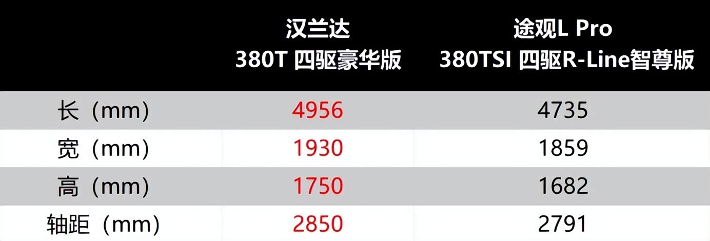 汉兰达的体型更大,而且内部为7座布局。而途观L为5座布局。