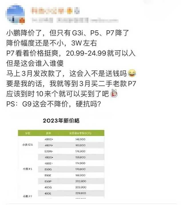 而相比小鹏P5、小鹏P7与小鹏G3i的降价,大家的更多关注点却是在小鹏G9身上,纷纷表示:“小鹏G9为何不降价”、“G9不降价,是要硬抗吗?”、“G9不降价,我要去隔壁看理想了”。