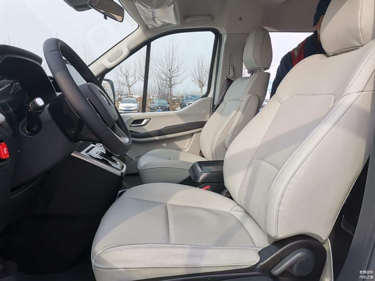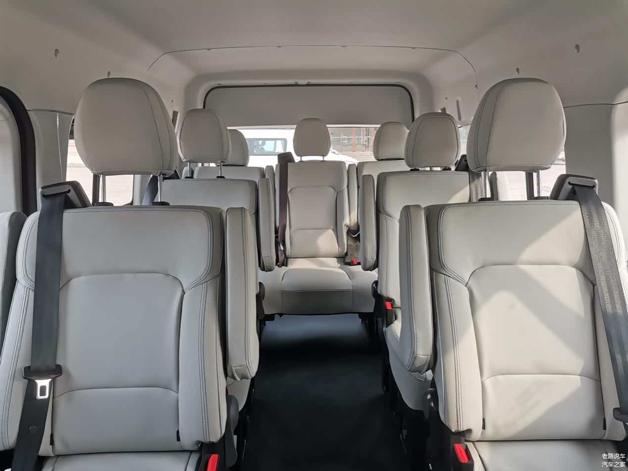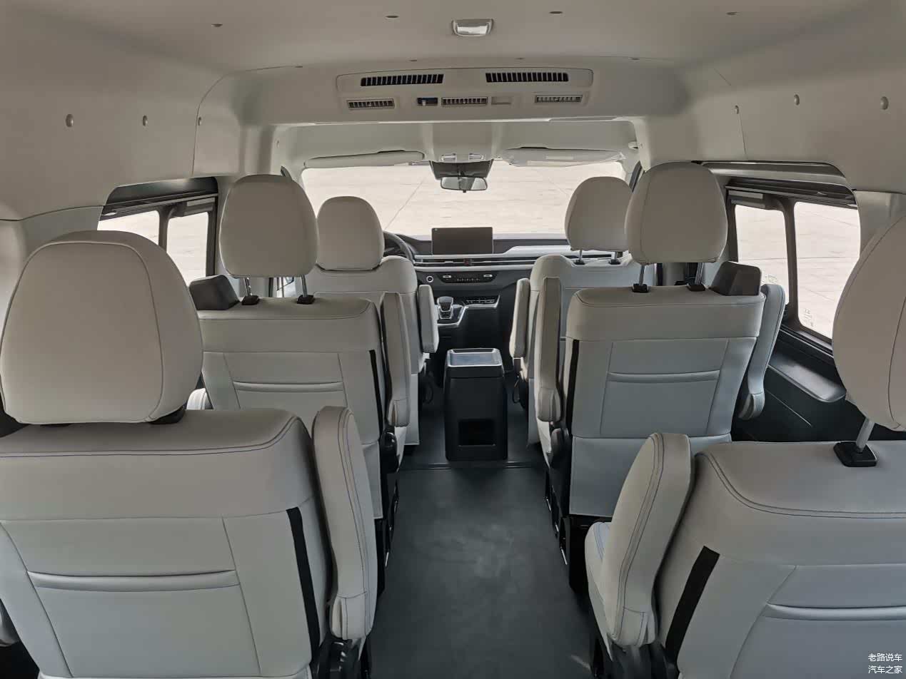 车上设有4排共9个座位,内饰颜色以上灰下黑为主。1750mm的跃级内宽,带给车上人员舒适的驾乘体验。内饰整体风格充满欧式的现代感,功能和细节都媲美乘用车。灰色的皮质座椅,样式美观,厚实舒适。车上带有一键启动功能,还配有电动门窗、电动后视镜、多功能方向盘、集成式挡杆、悬浮式中控屏,细节中充满了科技感。