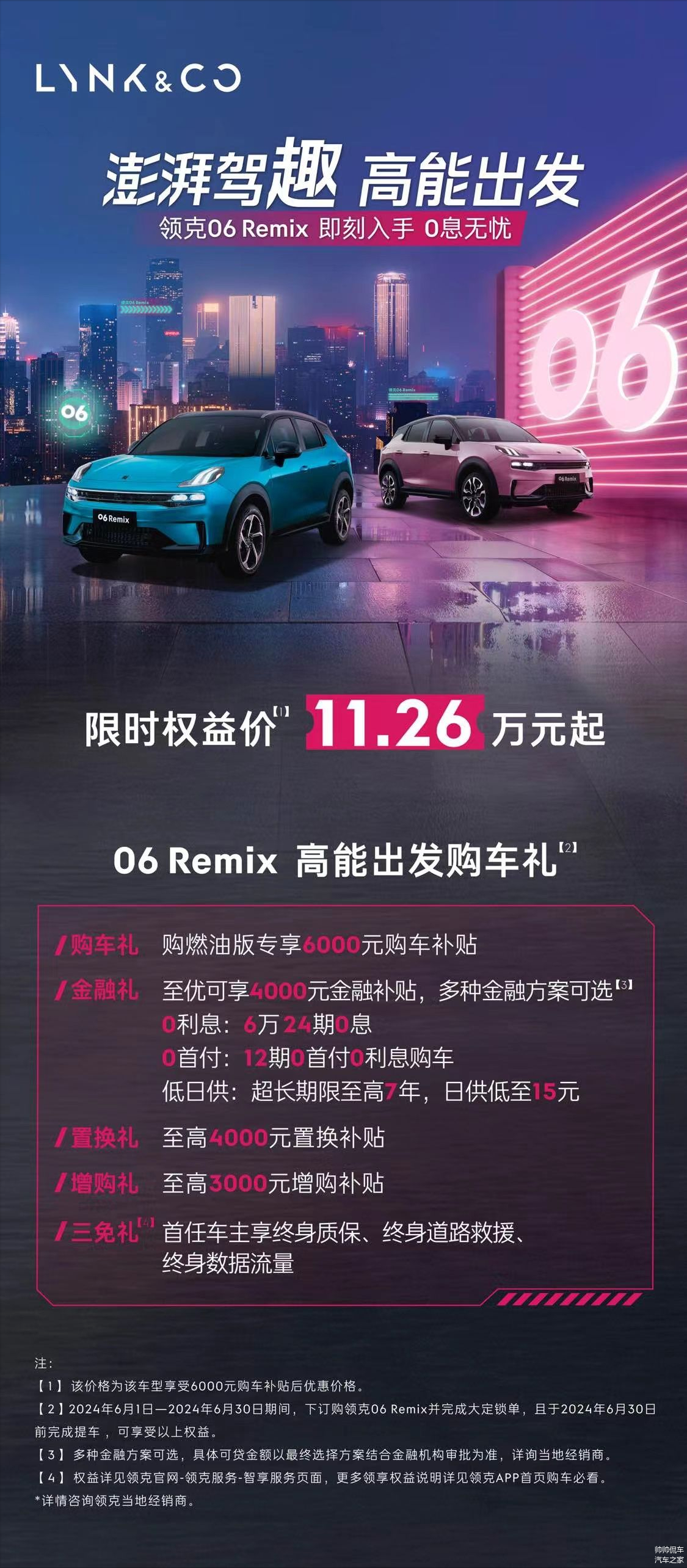 值得一提的是,领克06 Remix还释放了多项优惠政策,让更多消费者能够轻松拥有这款车型,仅需11.26万元起便能够将其带回家,同时还有购车礼、金融礼、置换礼、赠购礼和三免礼可享,多重好礼加持,让人很难不心动。可以说,选择领克06 Remix便是在选择一种全新的生活方式,对于追求卓越、想要享受生活的人而言,它绝对是一个不错的选择。