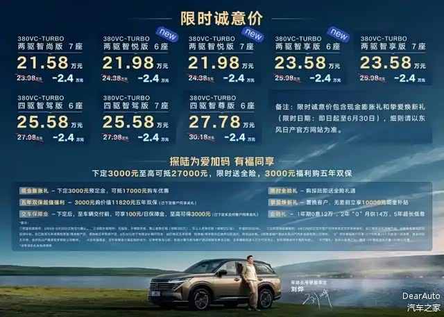 东风日产还非常宠粉听劝,探陆上市不久又满足用户,6月11日推出了两驱6座版,限时优惠价21.98万起;全系车型优惠后,入门版车型更是下探至21.58万起,对于一台合资中大型SUV来说,这个价格给力,真正实现两驱四驱、6座7座随心选。