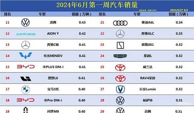 新能源车型的崛起不仅仅体现在销量上,更在于其市场占有率的提升。理想L6以0.41万辆的销量超越问界M9,成为新势力车型销量的领头羊。而传统燃油车如速腾、奔驰C级、宏光等车型的销量则有所下滑,其中速腾更是跌出了前10。