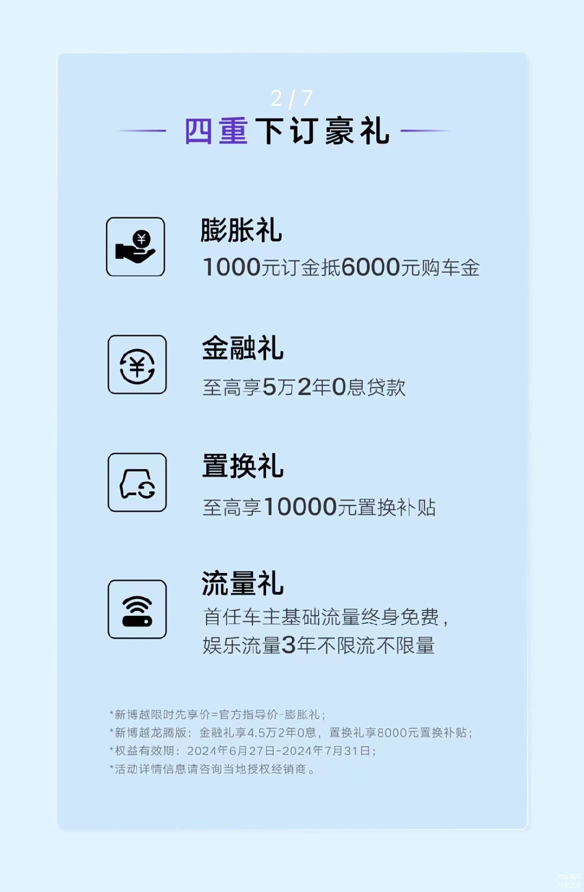 即日起至2024年7月31日,购车享订金膨胀,即交1000元订金抵6000元购车款,相当于优惠5000元,显示优惠价格为8.78-11.38万元。