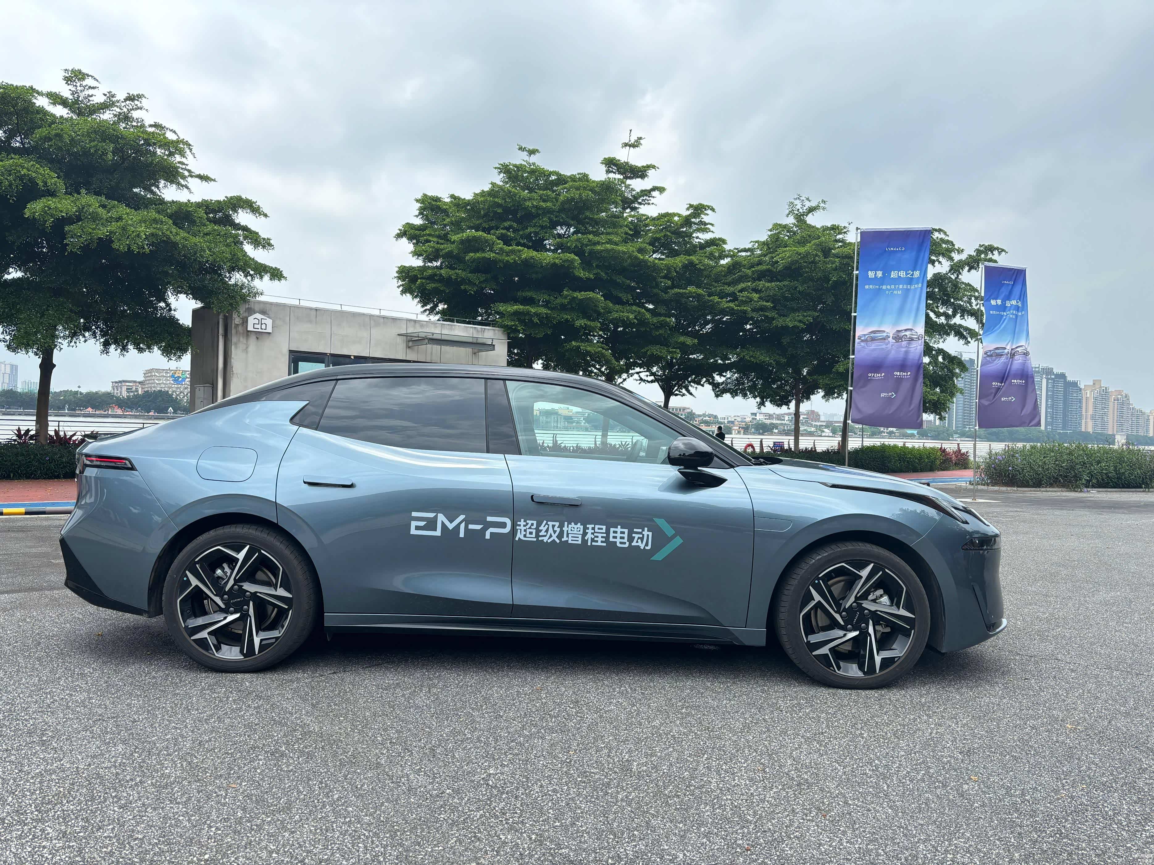 侧面是整车最为个性的部分,悬浮式车顶搭配双色车身,还有隐藏式门把手、无框车门。喜欢的人认为它很个性,不喜欢的人觉得领克07EM-P的侧面颇有日产蓝鸟的影子。