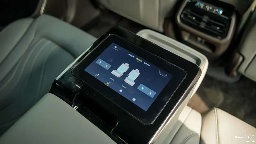 在后排中央扶手位置,车辆还加入了控制后排座椅的屏幕,包括座椅通风/加热/按摩都可以在上面进行控制。而在后排车窗控制区域里面还整合了一个可以控制后排座椅靠背角度的按钮。后排乘客可以更加轻松的调节到一个比较舒服的坐姿了。