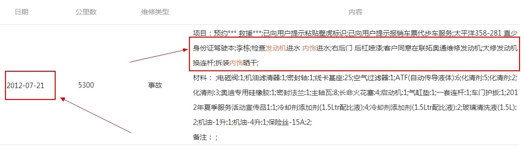 不知道大家能不能看清楚,有一条结构件维修记录。一条水淹记录,给大家看看水淹是亮点。