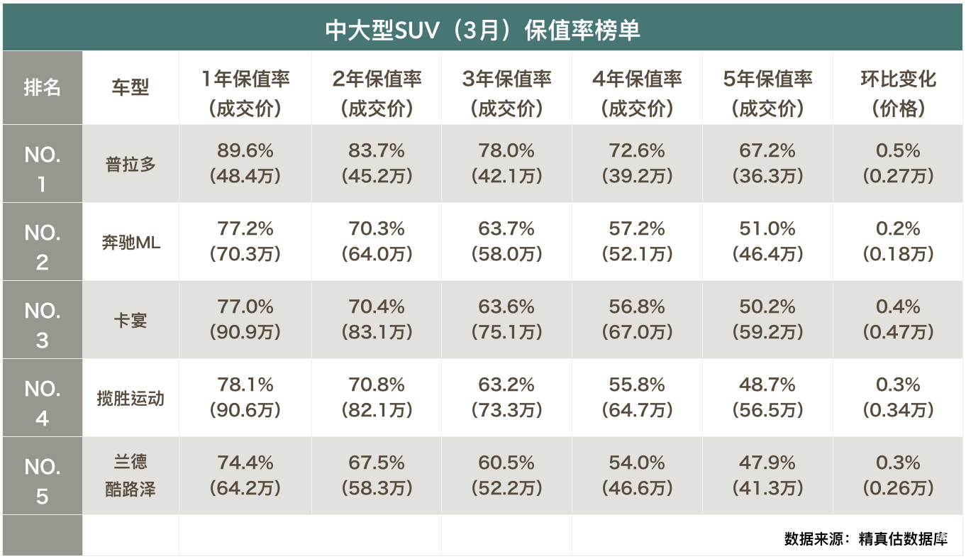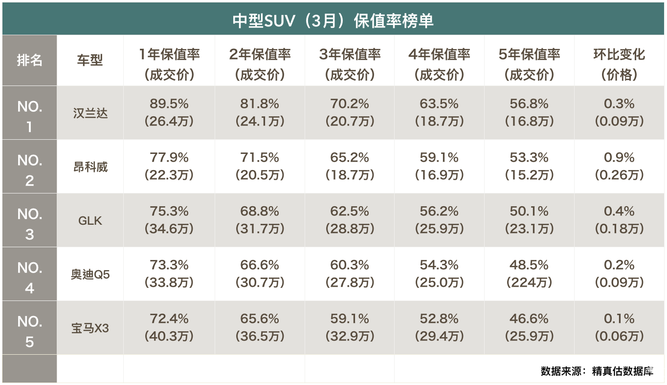 中型SUV(3月)保值率分析: