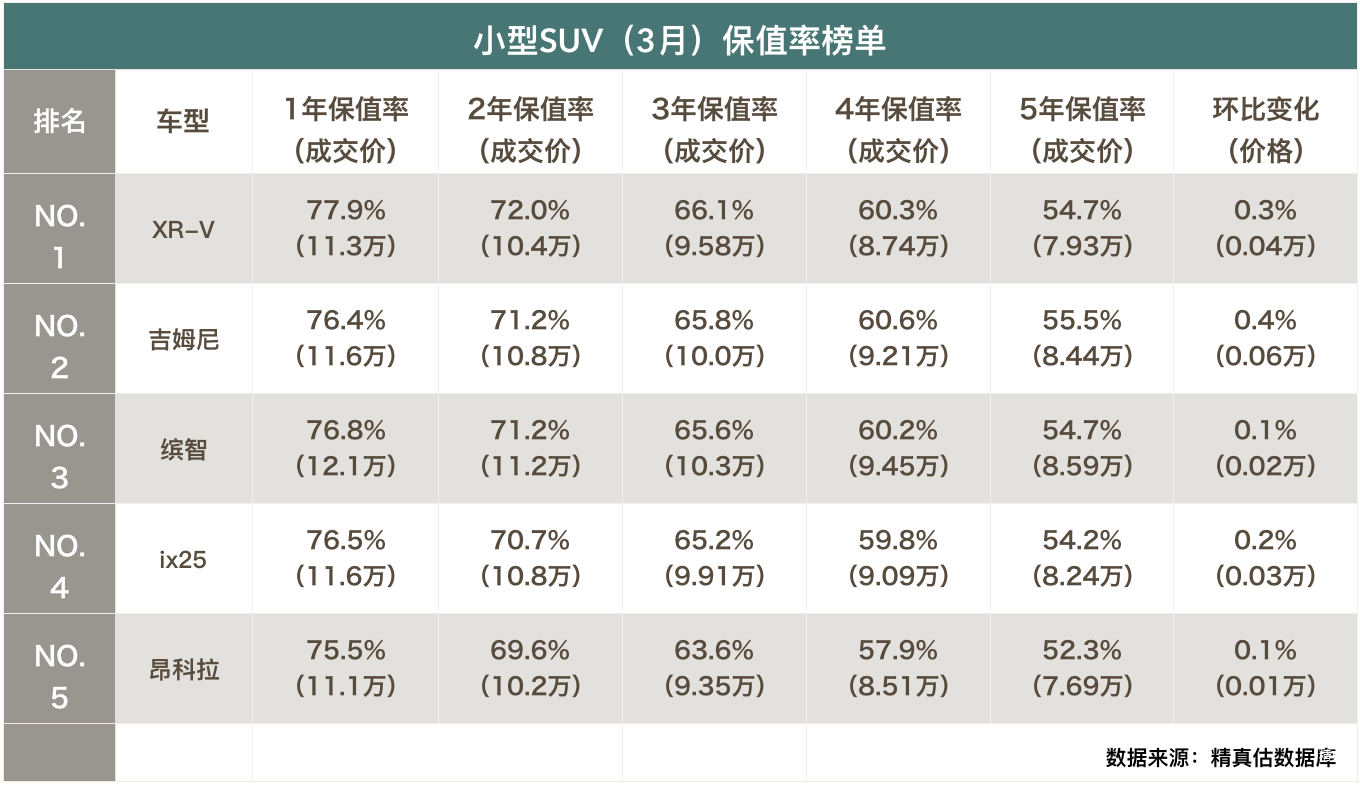 本田的两款紧凑型SUV占据市场前三,XRV外观更为时尚,缤智更加实用,市场需求大,供应不足;铃木吉姆尼主要是进口特殊群体车型,越野爱好者抬高了其保值率,国产维特拉有一定的影响;
