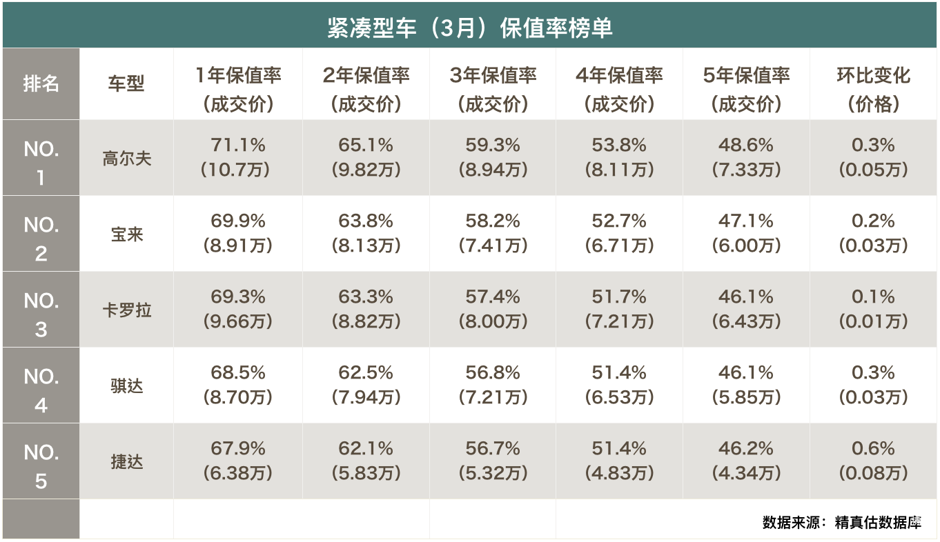 紧凑型车(3月)保值率分析: