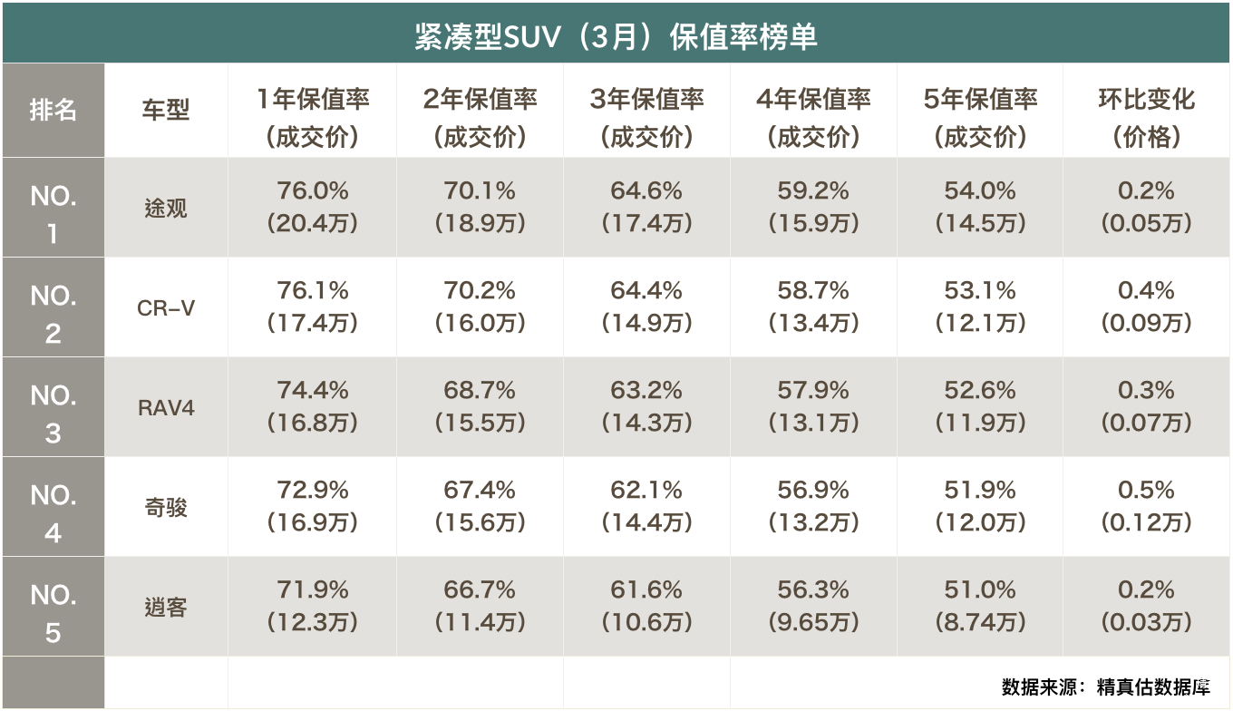 紧凑型SUV(3月)保值率分析: