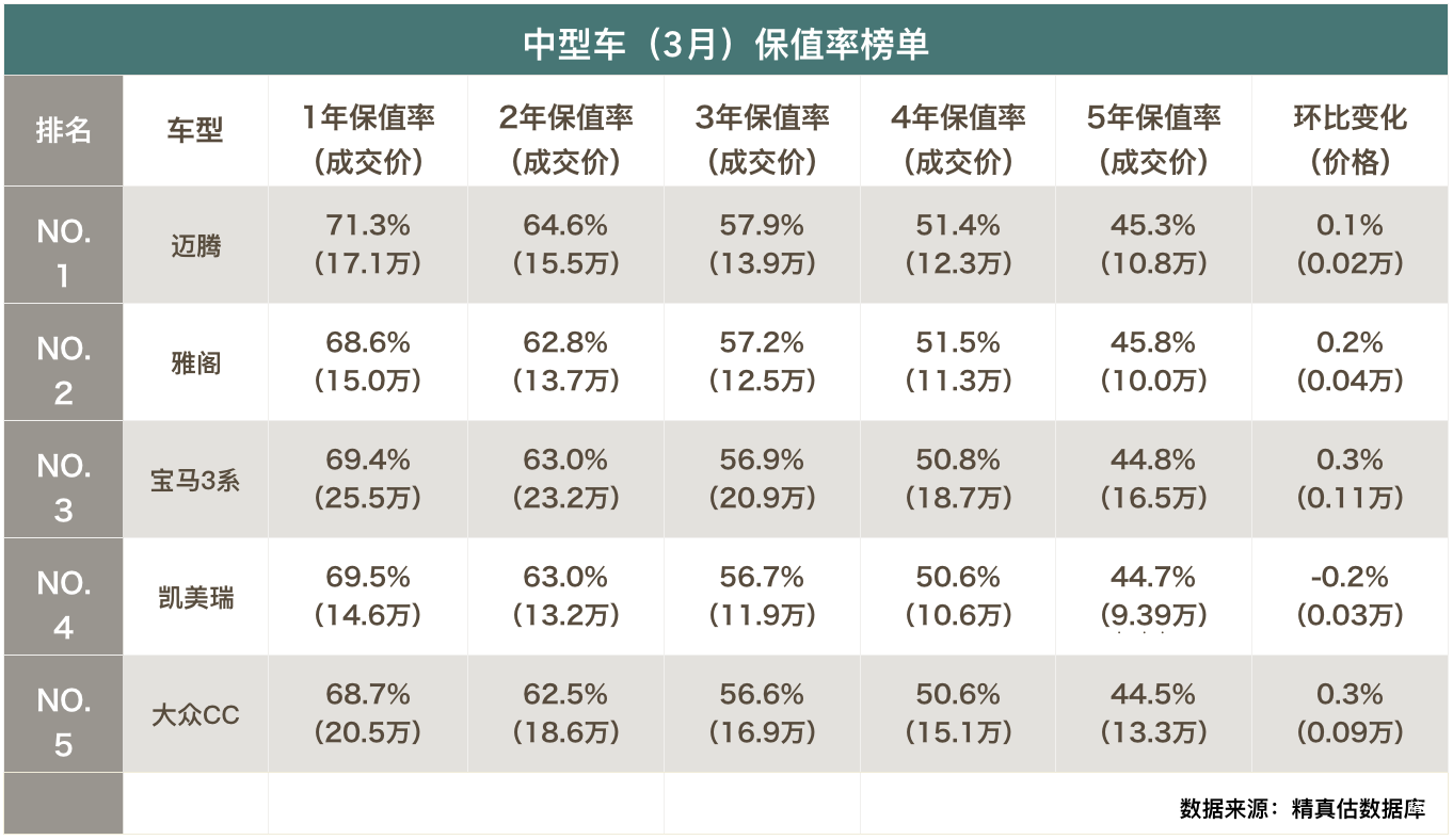 中型车(3月)保值率分析: