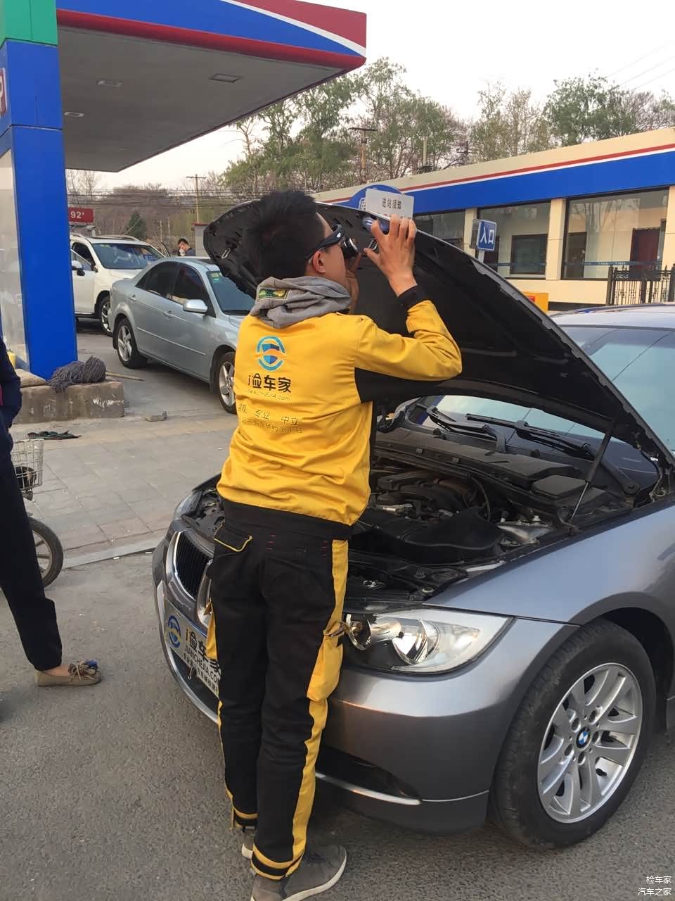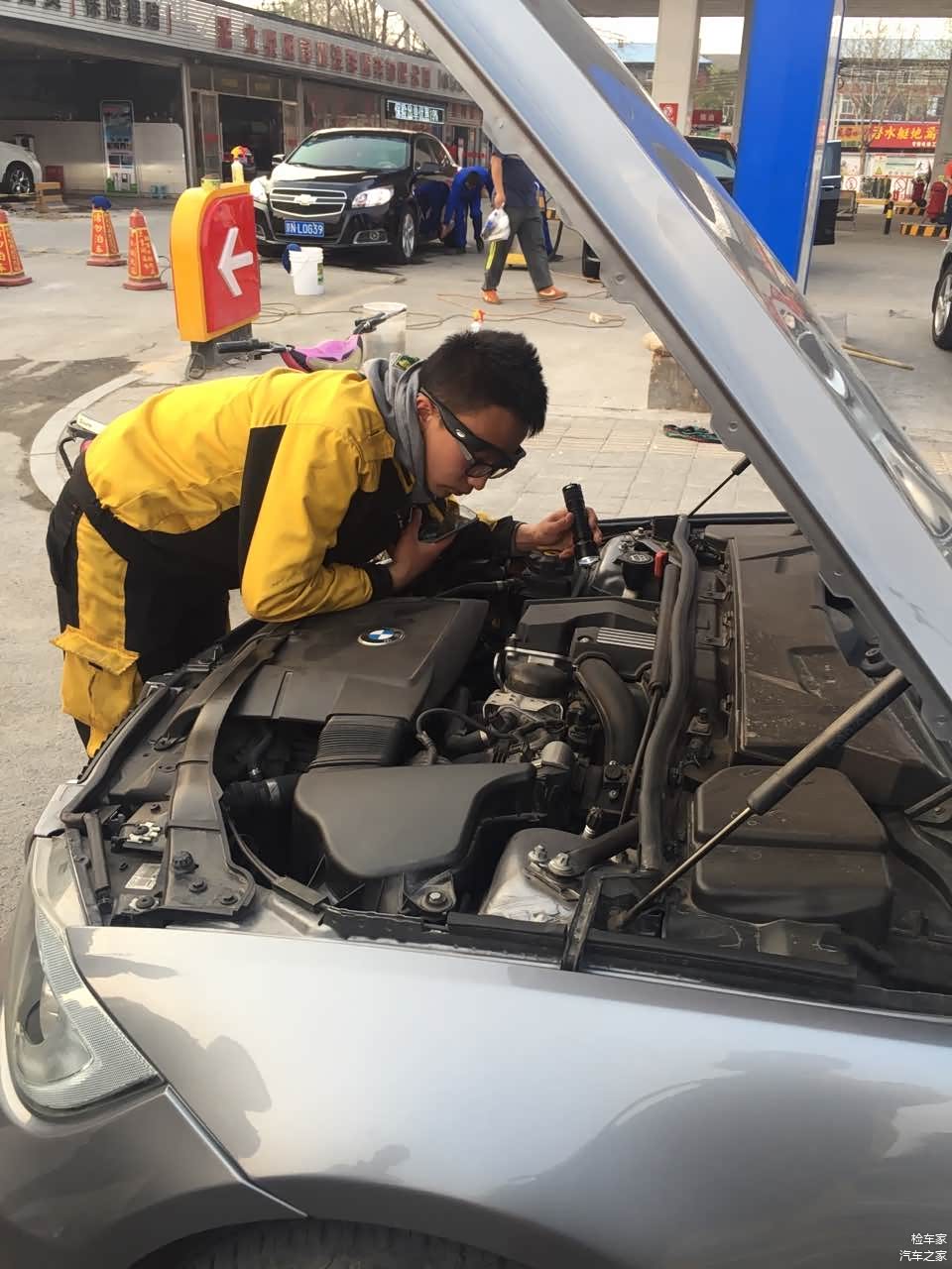 好了静态检测完成了,接下来该进行上架检测底盘了。此刻已经6点过了,为了便于客户方便上架,小编我提前让客户和卖家约好在一个加油站附近进行检测,不为别的,因为这个加油站我知道有举升机可以使用。之前小编我使用过几次,就是费用略高,上一次架居然要50块钱,真是黑到家了。不过没有办法,有时候检测就是这样,卖家能同意上架已经很难得了。更不用说去远处上架了,50就50吧反正也无所谓了,只要能进行底盘检测,让客户对整个车况有个全面了解这些都不重要。于是我去找加油站负责指挥举升机的人进行交涉时尴尬的一幕发生了。以下是小编和加油站的人对话全部内容。