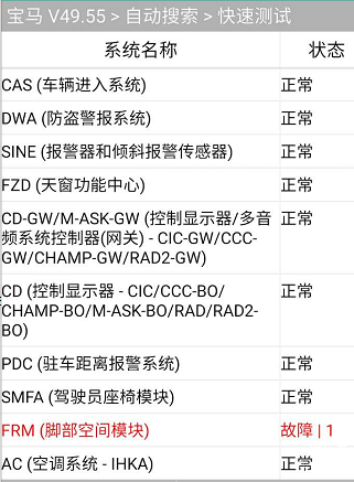 检测到一个故障码FRM(脚步空间模块)。这是一个经常遇到的故障,宝马FRM脚部空间模块损坏,会导致大灯失控、常亮或不亮、转向灯、升降玻璃失效、设备无法通信等现象。