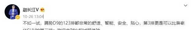 随后不久,腾势销售事业部总经理赵长江也参与进来,他表示“不如一试,腾势D9的123排都非常的舒适、智能、安全、贴心,第3排更是可以比肩豪华SUV的第二排;欢迎来对比和试驾体验。”
