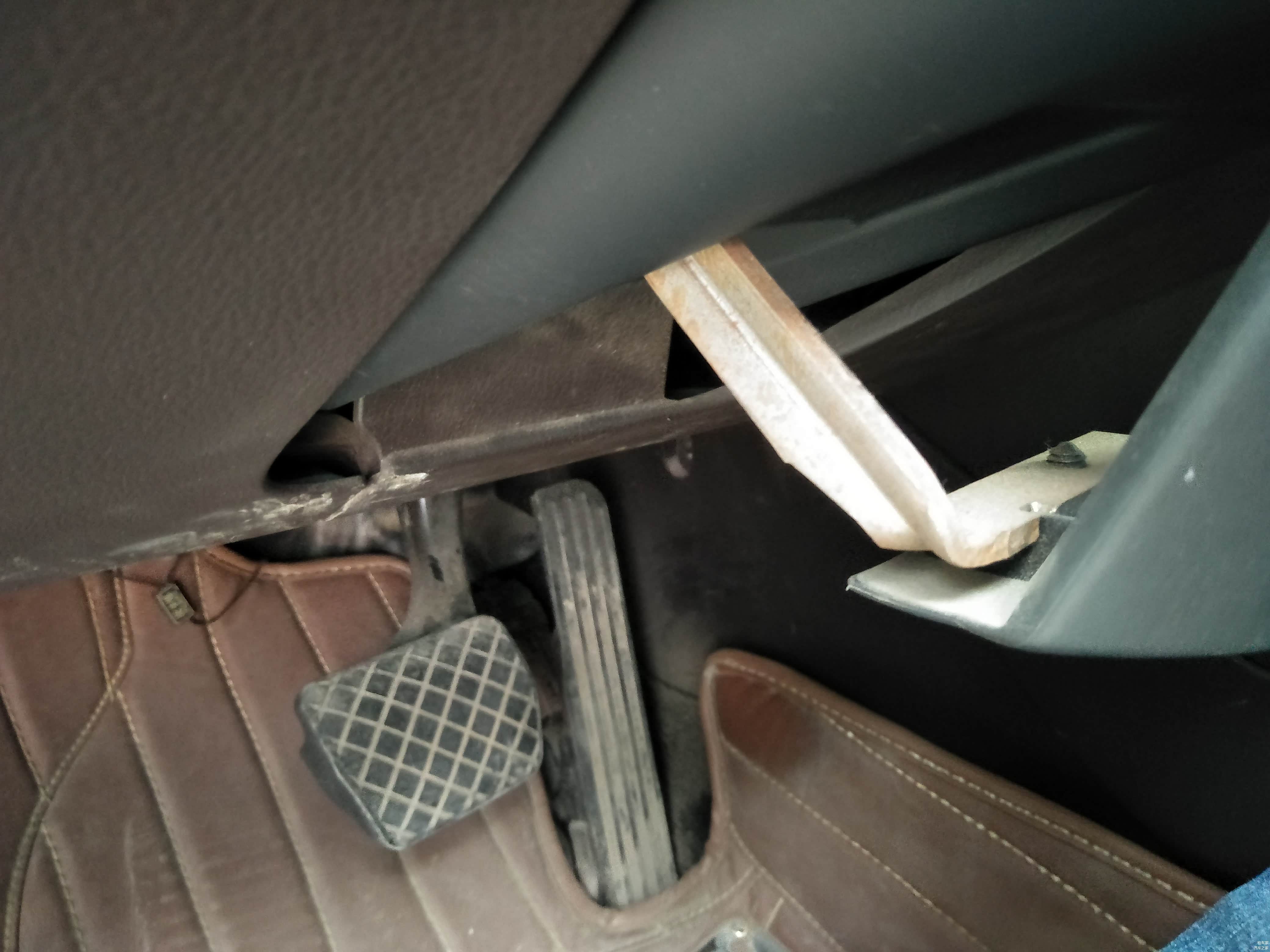 打开车门,小编发现顶棚不是原车的,小编心想也对,左边都钣金成这样了,大顶估计也坏了,接下来小编要对内饰检测了,首先看下主驾驶,油门,刹车踏板转向管柱,当小编看到转向管柱的时候发现生锈了。