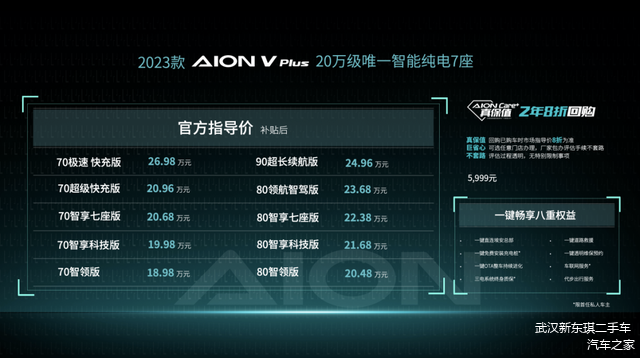 果不其然,翻了下市场行情,AION V Plus是目前20万级别里头唯一一款纯电7座SUV。这对于许多有孩家庭来说,绝对是一个重大利好消息,尤其是AION V Plus 七座版从功能到空间利用,几乎就是为他们量身定做的。