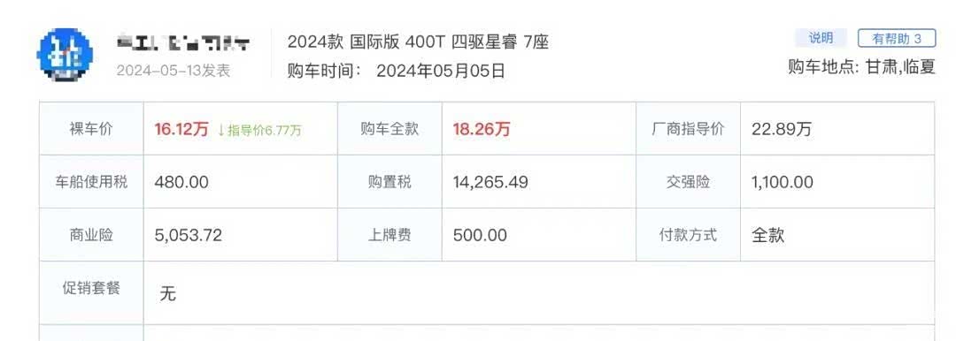 今天大家跟大家聊一款中大型SUV,无论是车身尺寸还是动力表现,都比汉兰达要强上一些,而且它的国际版车型在俄罗斯的售价高达6,500,000 卢布,约折合人民币53万人民币,这个价格在国内可以落地奥迪Q6了,而它在国内的起售价不过19.39万元,如今终端又有了近7万的优惠,在部分地区,2.0T+8AT+四驱+7座的最新款车型裸车价已经到了16.12万,可以说是非常实惠,它就是星途揽月。