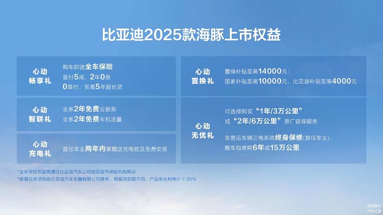 7月8日,比亚迪2025款海豚宠爱焕新暨第70万辆下线,售价为9.98万元-12.98万元。2025款海豚增配不加价,续航再升级,助力更多用户开启精致出行生活。现在购买的用户,更可享至高14000元置换补贴、购车即送全车保险等多重权益大礼。