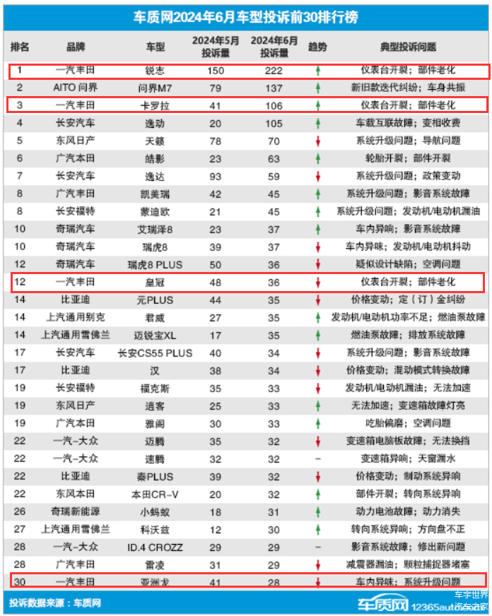 数据显示,2024年6月份,因部分用户投诉其存在着“仪表台开裂”、“部件老化”等问题,锐志位居同期车型投诉榜第1名。