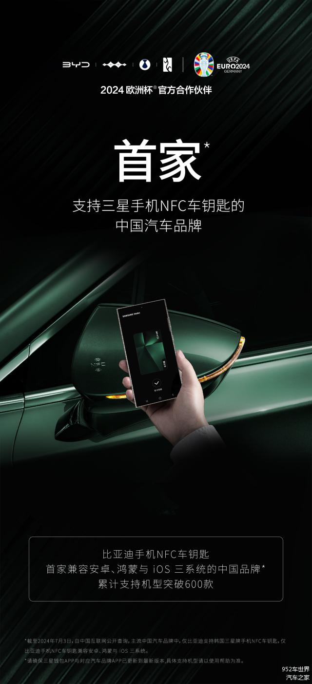 *截至2024年7月3日,自中国互联网公开查询,主流中国汽车品牌中,仅比亚迪支持韩国三星牌手机NFC车钥匙,仅比亚迪手机NFC车钥匙兼容安卓、鸿蒙与iOS三系统。