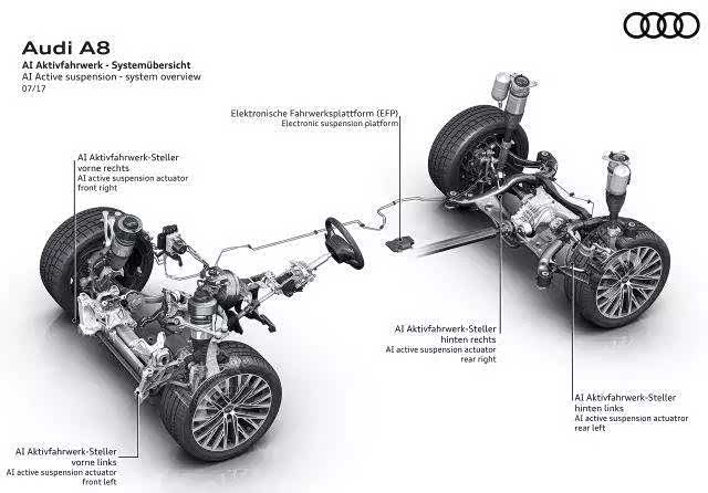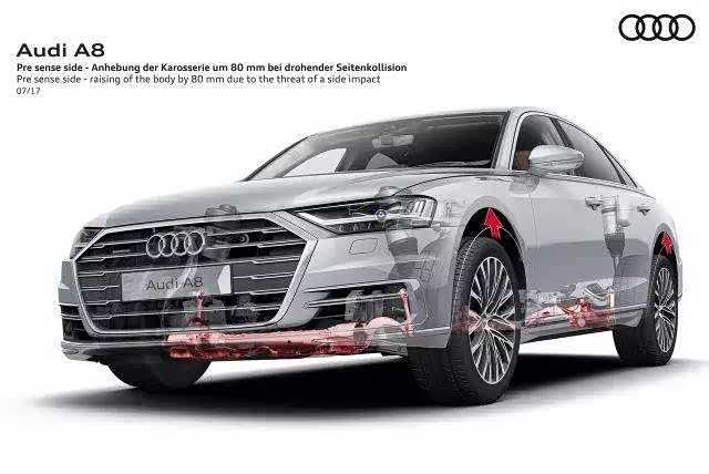 这可以说是A8L上最大的一个亮点了。不同于以往我们熟知的空气悬挂,新A8L的主动空气悬挂调节范围更加大而且更加智能。比如可以实时侦测路面起伏,在开启状态下可以尽早主动控制空气弹簧刚度,尽可能保证车辆姿态平稳。说起来它和奔驰的ABC(俗称“魔毯”)主动车身控制系统有异曲同工之妙,当然那个玩意只有在最顶级型号的S级上才会有。A8L这套空气悬挂附带一个主动安全技能。就是在检测到可能发生侧撞时,可以迅速抬高被撞侧车身高度,使用较为坚硬的车身下部来承受撞击力。听起来挺有趣的。