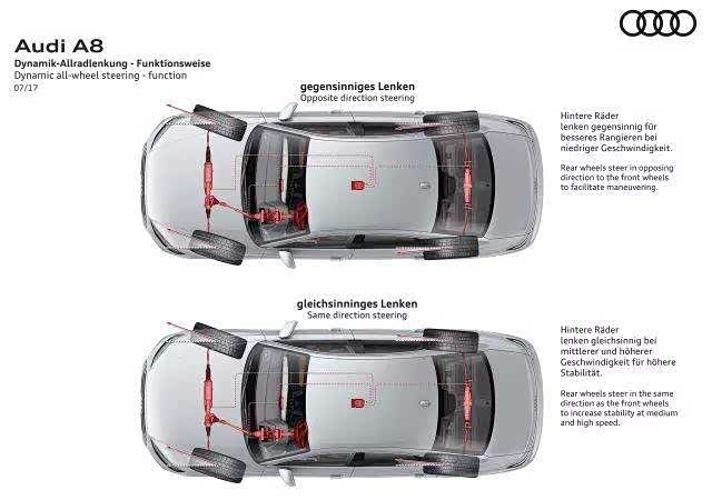 四轮转向系统不是什么新鲜的事物了。他的原理就是根据车速等信号采集,合理地对后轮采用同向或逆向的转向角,实现车辆低速时更加灵活地完成转弯,同时高速时又有着不错的转向跟随性。据了解,一台搭载主动转向系统的标准轴距A8的最小转弯半径甚至小于国产的长轴距A4L。可惜,国内市场如果需要它的话需要额外花费2.8万元,同时要面临的还有可能是遥远的交付日期。