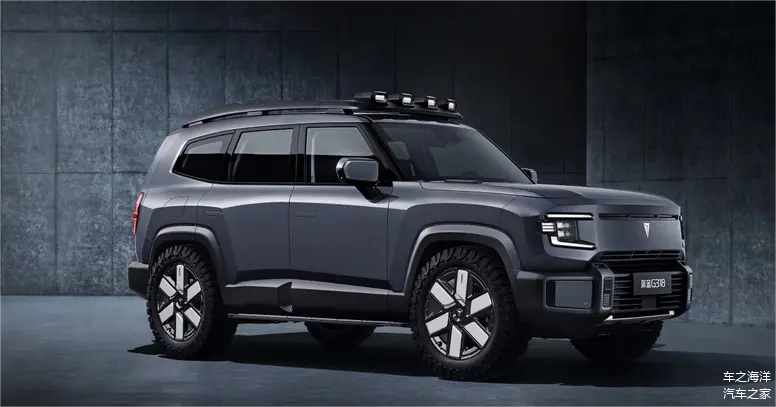 一眼看去,深蓝G318确实很“硬”。整车造型采用了硬派SUV惯用的“方盒子”设计,周身身采用了大量平直线条和棱角元素,散发着浓郁的肌肉感。遍布全身的黑色护板、车顶行李架、射灯、车尾的“小书包”以及侧开尾门等配置都很容易让人看到“野性”。