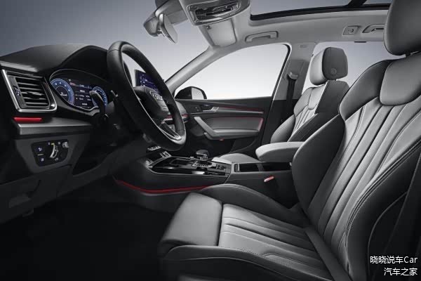 与外观一样,奥迪Q5L的内饰同样是非常精致的。奥迪Q5L中控台层次分明,从左到右的延伸,让目光所及之处犹如一望无尽的海平面,看起来十分通透。12.3英寸的全液晶仪表盘与10.1英寸的中控屏组合,不仅提升了视觉上的科技感,更是实用性的体现,得益于智行互联系统,搜索应用,看新闻,那都是一句话的事儿,用起来非常方便。奥迪Q5L的内饰,还采用豪华主题。简单来说,就是在材质选用上,奥迪Q5L更为高端,比如甄选特有的Nappa真皮、木纹饰条,双色撞色设计等,每处细节都能彰显豪华氛围,金属饰板与细腻的软质材料相得益彰,每一处触感都在默默诉说着豪华品牌的匠心独运。作为豪华SUV,奥迪Q5L在静谧性方面也做了优化处理,新车配备静音轮胎等。另外,在车门和地板,也采用隔音材质,配合主动降噪系统,车内静谧性也就达到了豪华车水平。