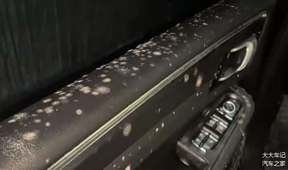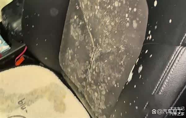 原本干净整洁的车内,此时多了一层黄色和白色的斑斓,从方向盘到座椅,从中控到车门,甚至天花板和脚垫上都长满了“霉菌”。