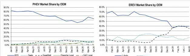 插混和增程市场份额集中,市场份额掌握在少数几个玩家手里。