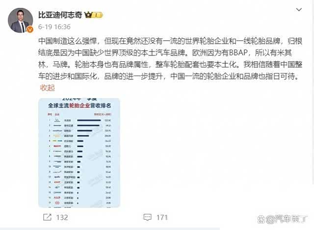 近日,比亚迪高管在接受采访时表示,目前国内虽有众多轮胎企业,但缺少真正世界级的一流企业和品牌。即便是大家耳熟能详的国产轮胎品牌,要想进入全球前十榜单,也是难上加难。