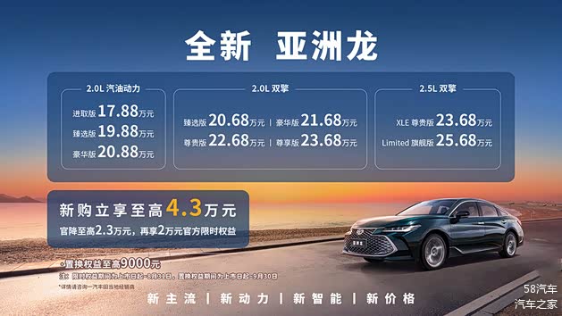 2024年7月12日,一汽丰田全新 亚洲龙(图片 | 参数 | 询价)正式上市,新车发布9款车型,官方指导价格17.88-25.68万元。其中,2.0L汽油动力3款车型售价分别为17.88、19.88、20.88万元;新增2.0L双擎动力4款车型售价分别为20.68、21.68、22.68、23.68万元;2.5L双擎共2款车型售价分别为23.68和25.68万元。