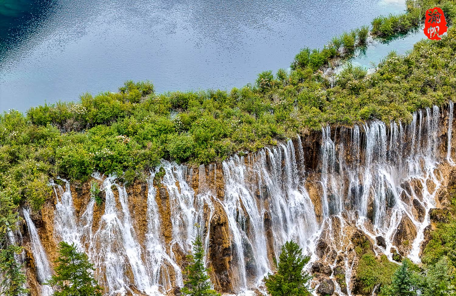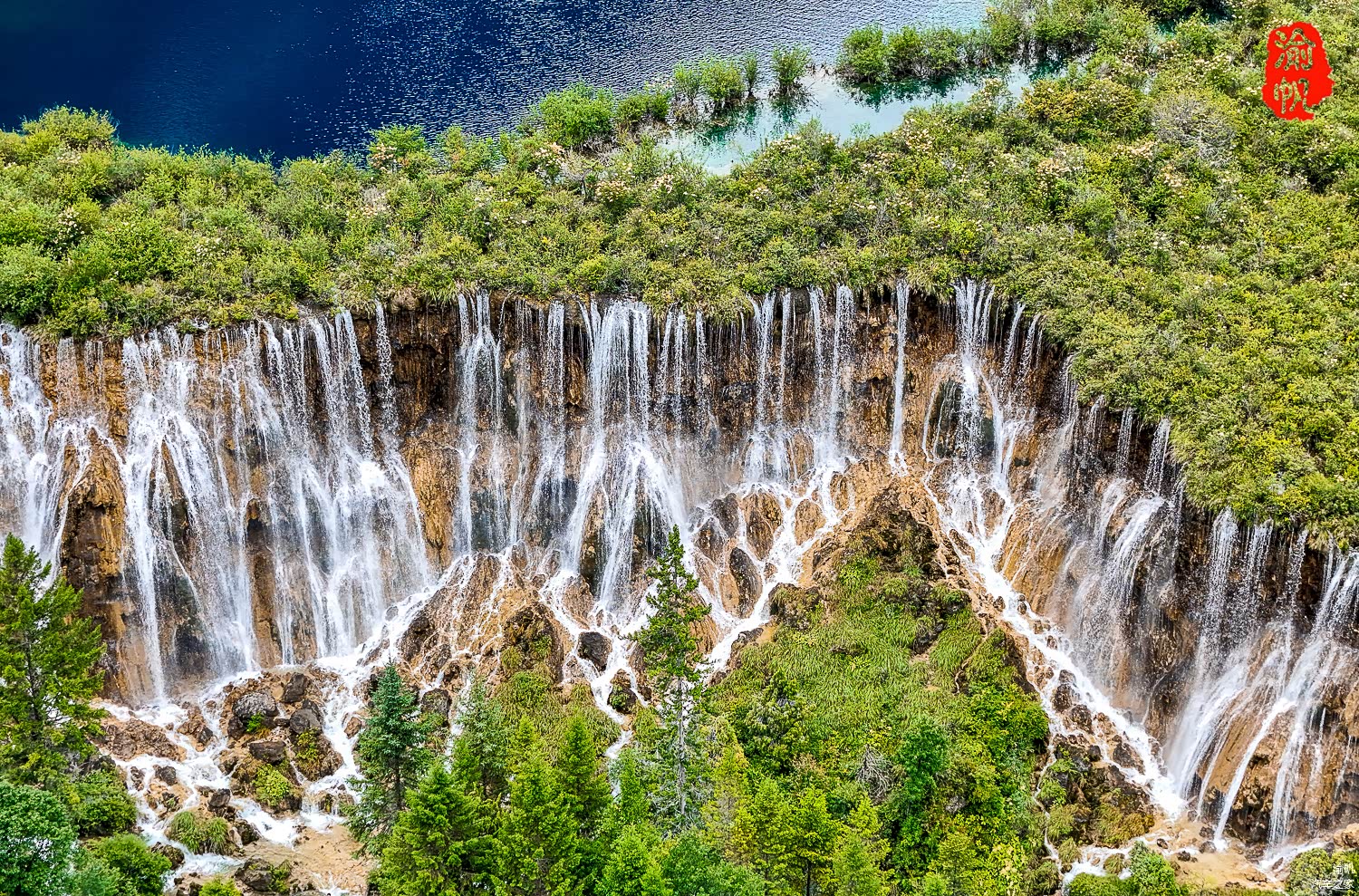 从照片中我们可以看到,现在时值盛夏,瀑布水量丰沛,声势壮大,水流跌落在瀑下岩石上,激起水花万朵,如银珠万斛,四处抛洒。然而,2017年8月8日的地震也给这片美丽的土地留下了痕迹,新鲜的泥土提醒我们,人类在自然面前是多么渺小,我们需要时刻敬畏自然,爱护这片土地。
