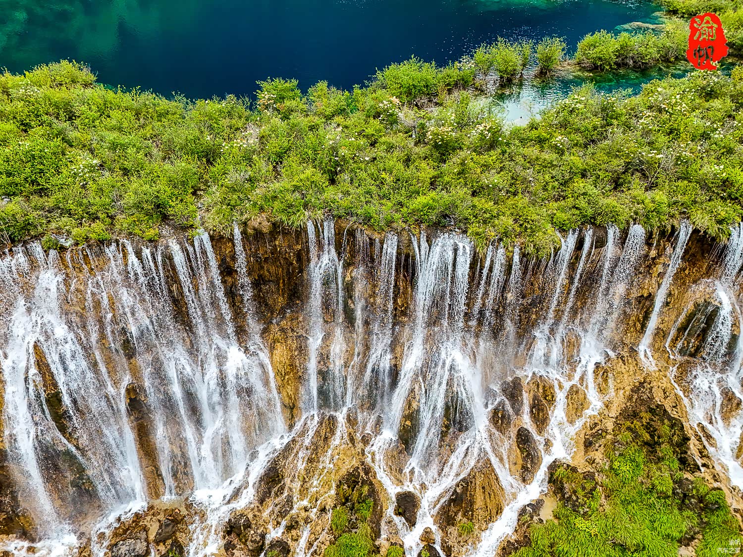 滔滔水流自诺日朗群海而来,经瀑布的顶部流下,如银河飞泻,声震山谷。南端水势浩大,寒气逼人,腾起蒙蒙水雾。瀑布对面建有一座观景台,站在台上,瀑布全景尽收眼底,我们有幸经过申请,获得了航拍的权限,于是升起无人机来拍下了这组照片;