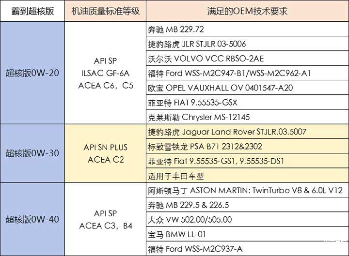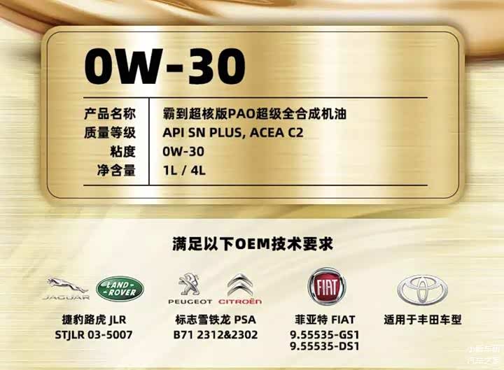 近日way神又更了,他检测了一款“霸到超核版PAO超级全合成机油0W-30”的机油新品,并发布了详尽的检测报告。该款霸到超核版PAO超级全合成机油共推出了0W-20、0W-30、0W-40三款不同粘度级别的产品,分别对应不同的质量标凖等级OEM技术要求,确保与各大品牌车型的高度匹配,满足28-40万级豪华车的保养用油需求。