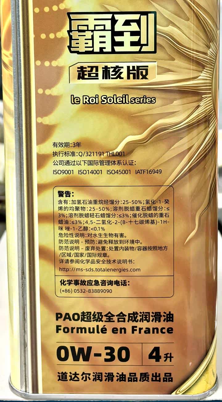 难能可贵的是,这款霸到超核版直接在包装上标注了产品成分和含量:深度加氢处理的第三类基础油25-50%,第四类基础油PAO 25-50%,不同工艺精制的矿物油≤9%。市面上敢于公开标注机油成分和含量的机油产品在极少数,霸到超核版做用料公开透明,让我们明明白白消费,确实值得表扬。