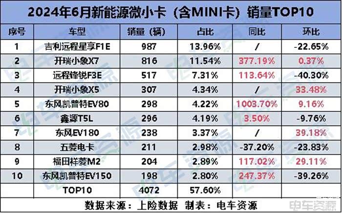6月新能源微小卡TOP10车型合计销量4072辆,占据该细分市场整体销量的57.6%。销量前三的车型较上月并无变化。从同比来看,东风凯普特EV80增长1003.7%,无疑是“最亮眼的星星”。