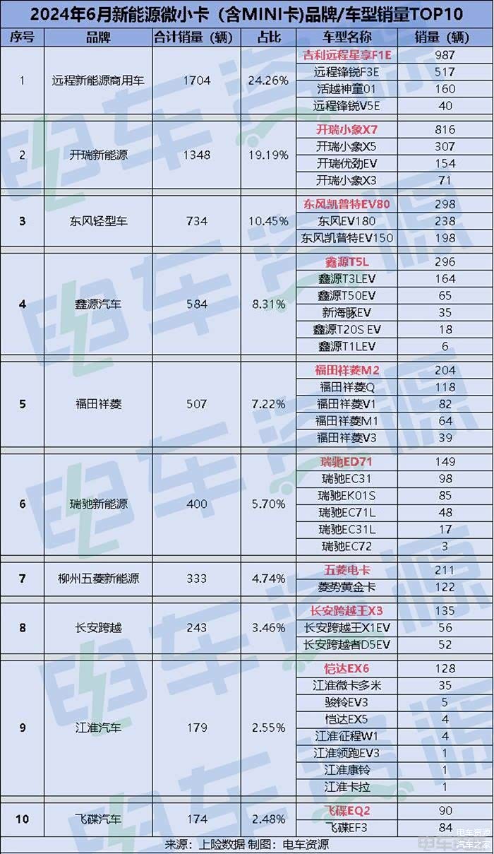 一个月的数据或许还不够说服力,我们将时间线拉长,回看2024年1-6月的新能源微小卡的销量数据可以发现,远程星享F1E、远程锋锐F3E这两款车型从未掉出车型销量排行榜前3,且销量遥遥领先,足已显现它们的影响力。