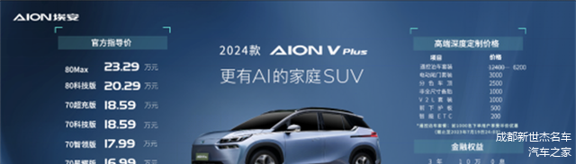 除了能满足全家需求的产品体验,埃安也为2024款AION V Plus配备了令人心动的价格及用户权益:15.99万起,让每一位家庭成员都成为VIP,17万即可买纯电7座;购车可享3年10万0息、至高6000元至高补贴及0首付等多种金融方案;同时还提供V2L对外放电套装等多样化的定制选装包,满足更全面的家庭需求,其中前1000名下单遥控泊车套装,可享受半价优惠!(2023年6月20日-2023年7月19日24:00)