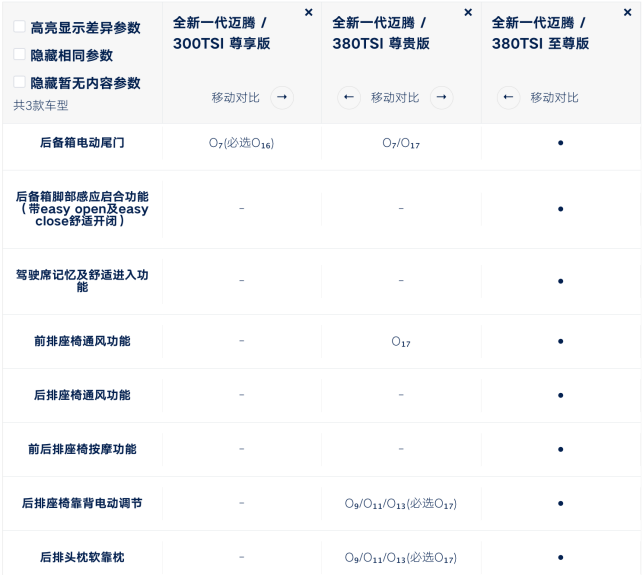 再来看看迈腾,虽然也配备了一键启动、无钥匙进入等功能,但近21万价位的尊贵版车型,前排座椅竟没有配备通风加热,而且在不增加选配的情况下,后排空调只有出风口,无法调节温度,甚至电动行李厢盖都没有,在舒适度和便利性上显然不如帕萨特。
