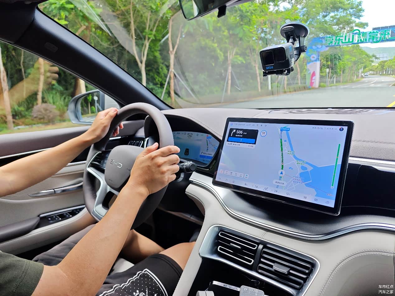 试驾当天深圳的最高气温是33℃,全程空调为自动挡,设置到24℃,能量回收强度为标准,驾驶模式为HEV和经济模式,并且测试全程为正常速度行驶,高速路况车速在80-90km/h之间,城区道路除拥堵路况外,车速也达到了60km/h左右。