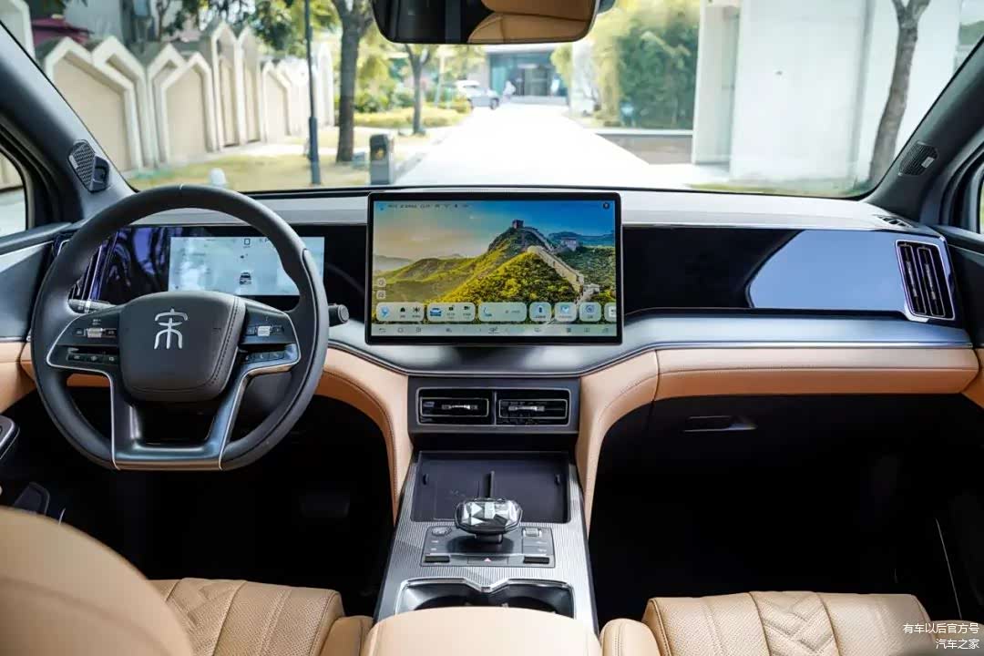 进到车内,你可以看到宋L DM-i的内饰提取宋代陶瓷、山水园林等诸多设计元素,能给人简约大气的感觉。整个中控台的视觉中心肯定是15.6英寸自适应旋转Pad,这也是比亚迪的“传统艺能”了。屏幕内置DiLink-100系统,功能性几乎没得挑。为了保证系统运行流畅性,新车还用上了6nm制程芯片,跑分超54万,领先行业常用的7nm 8155芯片。