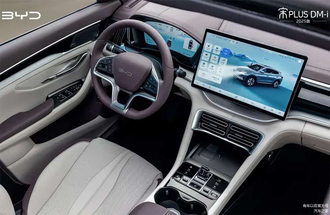 25款宋PLUS DM-i内饰设计基本和老款车型保持一致,仅是在配置上做了一定得调整。新车将配备平底方向盘、12.3 英寸全液晶仪表、电子挡把。75 公里和 112 公里车型配有 12.8 英寸中控屏,160 公里车型配备 15.6 英寸中控屏,支持 5G 网络和智能语音控制。