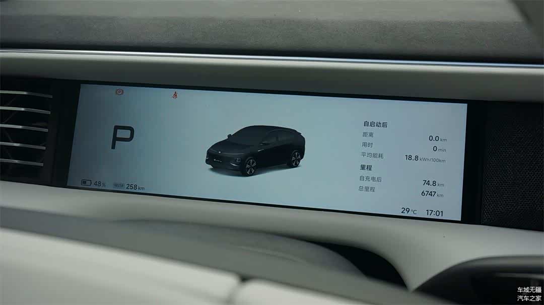 仪表屏取消了通常的手动切换主题的操作,变得更加智能化。譬如在驻车状态显示的是四门两盖的状态信息,行车的时候显示的是智驾系统感知的路况信息,进入导航或者驾驶辅助状态的时候就会添加导航信息和路线指引信息等。