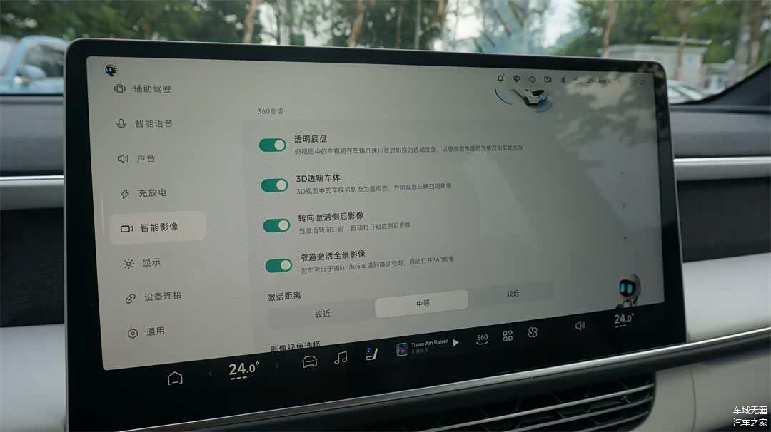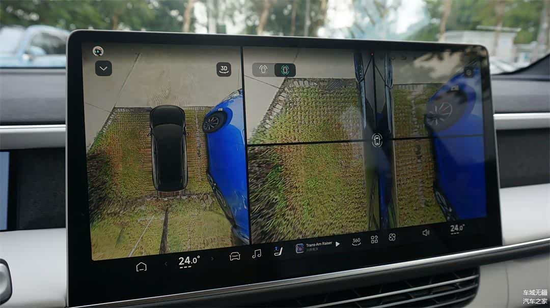 360全景的影像非常清晰,而且四侧的画面拼接效果非常自然。另外,360还带有转向时、遇到窄路时自动激活的功能,而且激活时的设计也经过了深思熟虑,譬如转向时弹出的是侧向摄像头的浮窗,不会影响当前的主页界面;或者在前雷达检测到前方道路狭窄的时候自动拉起360全景拼接视角的浮窗等等。