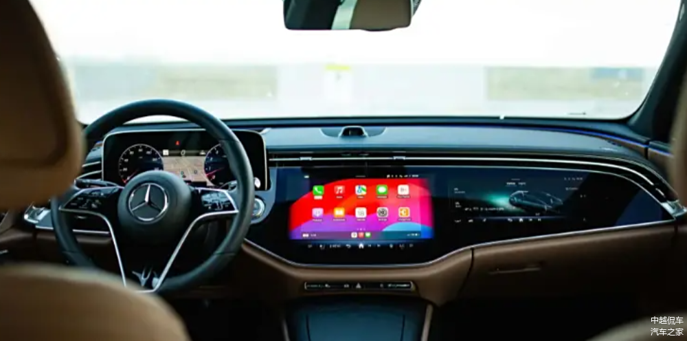 内部装潢方面,E450 与新 E 级风格一致。显示屏由三片独立液晶组成,左侧悬浮,右侧两片在玻璃面板下,悬浮大显示屏与 Hud 抬头显示联动,营造强烈科技氛围。环形空调设计和环抱型氛围灯带增添豪华感,车工系统等与常规版相同。