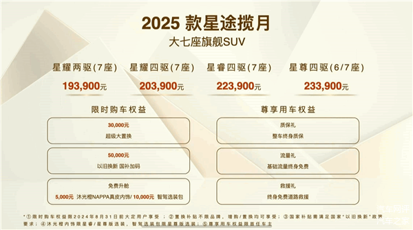 8月5日消息,今日下午,2025款奇瑞 星途揽月(图片 | 参数 | 询价)正式上市,共推出5款车型,售价区间为19.39-23.39万元。奇瑞汽车为新车提供了丰富的购车权益政策,包括30000元置换补贴、50000元以旧换新以及免费升舱等权益。如果用户充分利用这些补贴和置换权益,车辆的性价比将显得尤为突出。